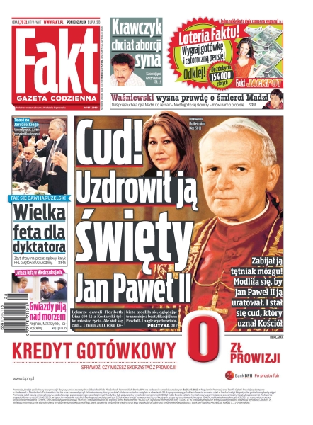 Ostateczny dowód świętości papieża Polaka; jak wyglądały urodziny generała Jaruzelskiego; tajemnice PRL – katastrofa w przepełnionym tramwaju na pomorzu; ojciec małej Madzi dziś znów staje przed sądem – ciekawe, czy nadal będzie bronić żony; cuda, krzyki i ekstaza na Stadionie Narodowym; co robi twoje dziecko, gdy ty jesteś w pracy; druga ofiara morza w Kołobrzegu; jak się pije w Międzyzdrojach; Rihanna na plaży w Sopocie; Legia mocniejsza po transferach; Szczęsny bardzo tęskni za Arsenalem; jedyny Polak w NBA będzie w kadrze na wrześniowe mistrzostwa Europy; paniczna ucieczka pasażerów