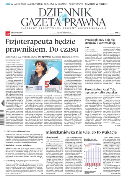 W jaki sposób najkorzystniej rozliczyć w kosztach podatkowych remonty w firmie; kolejne uczelnie oferują kandydatom podjęcie skróconych studiów prawniczych; pracodawcy nie czekają na spełnienie zapowiedzi strajku generalnego, który ma być przeprowadzony jesienią – przechodzą do kontrofensywy; zabójstwo nie powinno się nigdy przedawniać – uważa część prawników i apeluje o zmianę przepisów; deweloperzy kuszą klientów do swoich inwestycji promocjami i akcjami marketingowymi; poprawki w procedurze cywilnej mogą zablokować postępowania na wiele miesięcy – ostrzegają sędziowie; izby skarbowe, rozstrzygając sprawy, mogą organizować rozprawy, a podczas nich uzyskiwać potrzebne informacje od świadków, biegłych i podatników; Link4 zaoferuje młodym kierowcom tańsze ubezpieczenie pod warunkiem że zgodzą się, by każdy ruch pojazdu był rejestrowany.