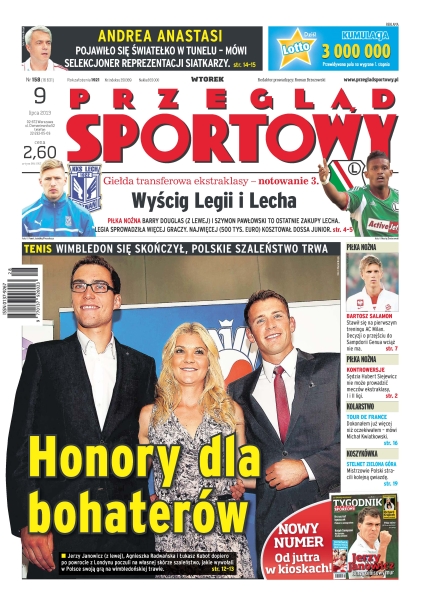 Jerzy Janowicz, Agnieszka Radwańska i Łukasz Kubot dopiero po powrocie z Londynu poczuli na własnej skórze szaleństwo, jakie wywołali w Polsce swoją grą na wimbledońskiej trawie; ważą się losy Bartosza Salamona; po sprowadzeniu do Realu Isco Kaka znów zostanie odsunięty na boczny tor, ale odejść nie chce; bardzo dobrze poradzili sobie jadący Tatrą w barwach Lotto Team Robin Szustkowski i Jarosław Kazberuk na pierwszym etapie rajdu Silk Way; czy tego człowieka i jego team może jeszcze ktoś powstrzymać – zbliżamy się do połowy sezonu Formuły 1, a głównym kandydatem do mistrzostwa jest ten sam facet, który zdobył trzy poprzednie tytuły.