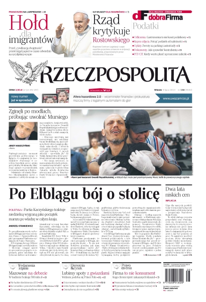 Partia Kaczyńskiego traktuje niedzielną wygraną jako początek marszu po władzę w całym kraju; dlaczego Mazowsze nie chce płacić janosikowego; odwołując się od decyzji biskupa Henryka Hosera, proboszcz Jasienicy ujawnia głęboki konflikt z przełożonym; Ministerstwo Pracy chce odmrożenia środków z Funduszu Pracy; dobrobyt nie może zabijać wrażliwości – tak na Lampedusie Franciszek bronił godności imigrantów; nie wszyscy żołnierze chcieli strzelać – Bractwo Muzułmańskie liczy na rozłam w armii; Muzeum Narodowe w Krakowie prezentuje kolekcję legendarnego fotografa Franza Christiana Gundlacha; na naszej planecie rozwija się nowy ekosystem – to różnego rodzaju drobnoustroje żywiące się chemicznymi śmieciami dryfującymi po morzach; Michał Kwiatkowski: nie trzeba jechać cicho, by zajechać daleko.