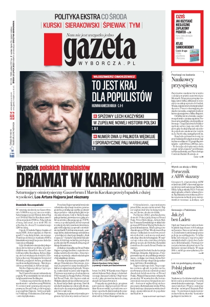 Szturmujący ośmiotysięczny Gaszerbrum I Marcin Kaczkan przeżył upadek z dużej wysokości – los Artura Hajzera jest nieznany; porucznik Grzegorz S. z ABW został skazany na pół roku więzienia za błędy popełnione podczas próby zatrzymania Barbary Blidy; w rządzonym przez Prawo i Sprawiedliwość Kraśniku zapowiadana odnowa moralna poszła tak daleko, że kierowca burmistrza połamał nogi, uciekając z mieszkania przyjaciółki, w którym omawiali oboje „sprawy partyjne”; gigantyczna biografia Lecha Kaczyńskiego ma pognębić jego wrogów; sensacyjny raport o życiu szefa Al-Kaidy w Pakistanie; naukowcy z Łodzi opracowali nową metodę leczenia stwardnienia rozsianego; jak ubezpieczyć samochód; tylko do 18 lipca można występować do fiskusa o zwrot niesłusznie zapłaconego podatku od spadku.