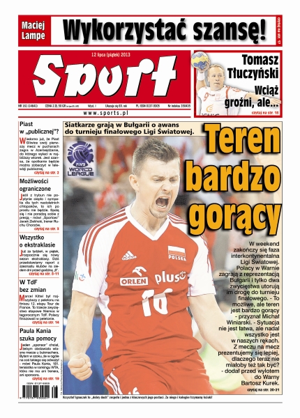 Siatkarze grają w Bułgarii o awans do turnieju finałowego Ligi Światowej; trener Bayernu chce sprowadzenia Thiago Alcantary, a Borussia jest zachwycona po debiucie Henricha Mchitariana; zwycięzca czterech etapów w wyścigu Dookoła Polski demonstruje swoje sprinterskie umiejętności także na trasie Wielkiej Pętli; Robert Kubica na liście zgłoszeń do Rajdu Finlandii, kolejnej eliminacji mistrzostw świata; Rajd Silk Way jak na razie układa się po myśli startujących w barwach Lotto Team Robina Szustkowskiego i Jarosława Kazberuka.