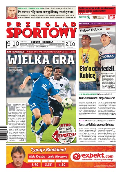 Euzebiusz Smolarek już niedługo może zagrać w barwach Arisu Saloniki; w wiosennym hicie Ekstraklasy Wisła Kraków zmierzy się z Legią Warszawa - która z drużyn ma większe szanse na zwycięstwo; czy którykolwiek z angielskich zespołów ma jeszcze szansę dogonić Manchester United w walce o tytuł mistrza kraju; wywiad z Mariuszem Lewandowskim, zawodnikiem Szachtara Donieck; czy Robert Kubica jest w stanie zająć wysoką lokatę podczas Grand Prix Formuły 1 w Hiszpanii; rozmowa z Tomaszem Gollobem.