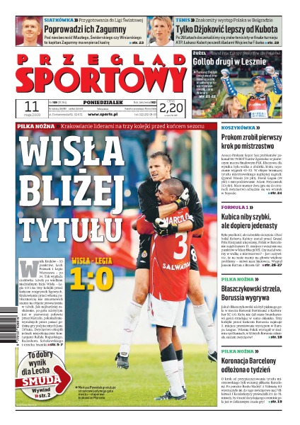 Szczegółowa analiza spotkań 27. kolejki piłkarskiej Ekstraklasy; wywiad z Franciszkiem Smudą, trenerem Lecha Poznań; sprawozdanie z najciekawszych meczy Pierwszej Ligi; Manchester United jest coraz bliżej obrony tytułu mistrza Anglii; rozmowa z Tomaszem Gollobem przed Grand Prix Europy 2009; Prokom pokonał Turów 99:79 w pierwszym finałowym meczu PLK; Robert Kubica zajął 11. miejsce w Grand Prix Hiszpanii.