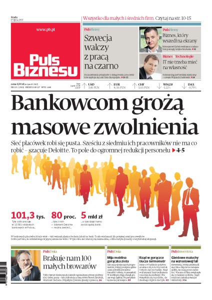 Bankowcom grożą masowe zwolnienia; o uruchamianie małych browarów apeluje Marek Jakubiak, prezes Browarów Regionalnych Jakubiak; w branży gier na komórki i tablety historie sukcesów pojedynczych programistów to już przeszłość – teraz walczą giganci.