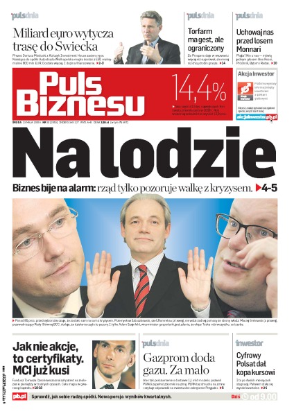 AW SA dostała od Europejskiego Banku Inwestycyjnego 1 mld euro na budowę autostrady do Świecka; aż 84 proc. szefów firm krytycznie odnosi się do antykryzysowej działalności rządu Donalda Tuska; Gazprom dostarczy Polsce dodatkowo 1,1 mld m sześc. gazu; czy cyfryzacja ma szansę wywołać prawdziwą rewolucję teleinformatyczną; certyfikaty są aktualnie najlepszym sposobem na pozyskanie pieniędzy.