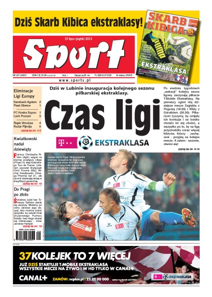 Dziś w Lubinie inauguracja kolejnego sezonu piłkarskiej ekstraklasy; Christoph Ribion wygrał na słynnej przełęczy L'Alpe d'Huez 18. etap kolarskiego Tour de France; rozmowa z żużlowcem Jarosławem Hampelem.