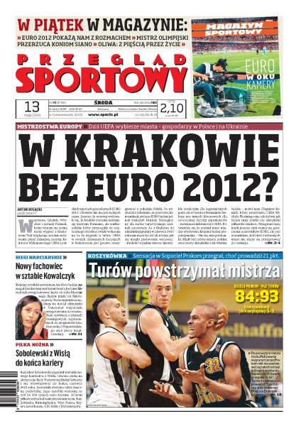 Dziś UEFA ogłosi, w których miastach Polski i Ukrainy rozgrywane będą mecze Euro 2012; rozmowa ze Zbigniewem Bońkiem; wciąż nie wiadomo ,która z niemieckich drużyn wywalczy tytuł mistrza Bundesligi; wywiad z Justyną Kowalczyk, podwójną mistrzynią świata w biegach narciarskich; w drugim meczu finału PLK Turów Zgorzelec pokonał Asseco Prokom 93:84; za walkę o tytuł mistrza świata federacji WBC Krzysztof Włodarczyk zarobi zaledwie 90 tys. euro.