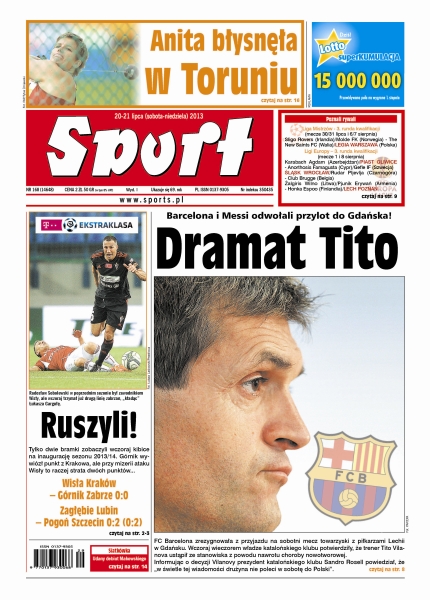 Na 24 godziny przed historycznym dla Gdańska meczem Barcelona odwołała przylot do Polski – powodem jest nawrót choroby nowotworowej trenera Tito Vilanovy, który wczoraj ustąpił ze stanowiska; polskie zespoły poznały swych potencjalnych rywali w II rundzie eliminacyjnej Ligi Mistrzów i Ligi Europy; Martin Kaczmarski i Bartłomiej Boba spotkają na trasie takie sławy rajdów cross country, jak Jean-Louis Schlesser, Nani Roma czy Krzysztof Hołowczyc; kielecki klub wygrał bój z Barceloną o hiszpańskiego kołowego, Julena Aguinagalde; kolejny etap dla Rui da Costy – liderem wciąż jest Christopher Froome, a Michał Kwiatkowski utrzymał miejsce w dziesiątce; Anita Włodarczyk była zdziwiona swoim rezultatem – drugim w tym roku na świecie – niewiele brakowało, by Piotr Małachowski spóźnił się na start.
