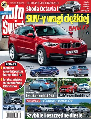 BMW X7, Mercedes GL coupé i Audi Q8 – duże SUV-y dla najzamożniejszych; Honda Jazz – pierwsza jazda hybrydową japońską wersją Fit; Mazda 3 kontra Ford Focus; Audi RS 7 Sportback – elegancja w sportowym wydaniu; Honda Civic Tourer – wrażenia z jazd najpraktyczniejszym Civikiem; porównanie kompaktów z mocnymi dieslami; Lancia Thema – amerykańsko-włoska limuzyna klasy wyższej; Toyota Auris Touring Sports – pierwszy test nowego kombi na bazie Aurisa; BMW X6 M50d – supermocna dieslowska wersja SUV-a.