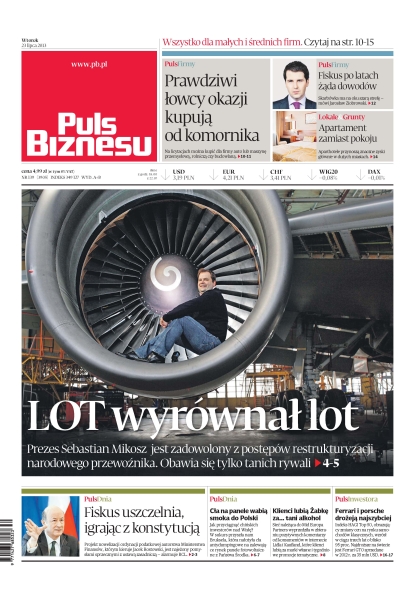 Prawdziwi łowcy okazji kupują od komornika – na licytacjach można kupić dla firmy auto lub maszynę przemysłową, rolniczą czy budowlaną; fiskus po latach żąda dowodów – skarbówka ma na oku szarą strefę; aparthotele przynoszą znaczne zyski głównie w dużych miastach; LOT wyrównał lot – Prezes Sebastian Mikosz jest zadowolony z postępów restrukturyzacji narodowego przewoźnika; Cła na panele wabią smoka do Polski.