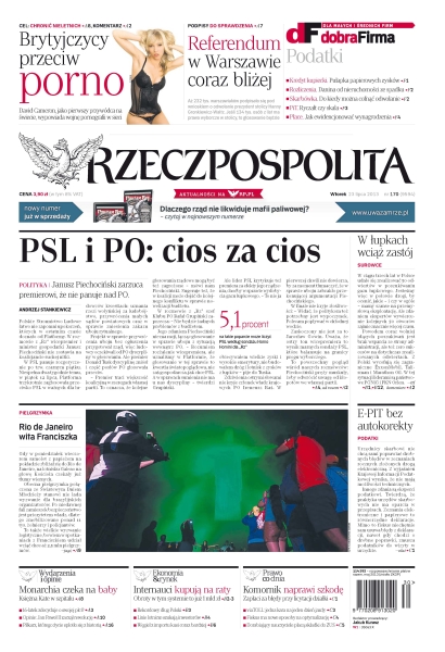 Janusz Piechociński zarzuca premierowi, że nie panuje nad PO; Rio de Janeiro wita Franciszka; David Cameron, jako pierwszy przywódca na świecie, wypowiada wojnę pornografii w sieci; referendum w Warszawie coraz bliżej; w łupkach wciąż zastój; e-PIT bez autokorekty; internauci kupują na raty – obroty w tym systemie to już 1 mld zł.