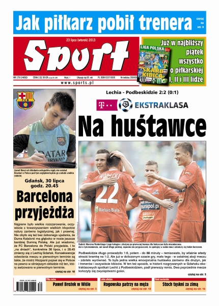FC Barcelona przyjedzie do Polski, i to „na dniach”, konkretnie 30 lipca, i o 20.45 zmierzy się z Lechią Gdańsk; Lechia w drugiej połowie dominowała nad Podbeskidziem w sposób niepodważalny, ale zwycięstwo straciła w ostatniej sekundzie meczu; Wrocławianom znowu nie udało się zwyciężyć w Kielcach; Liga Światowa – Rosjanie w wielkim stylu pokonali w finale Brazylię i po roku przerwy wrócili na tron.