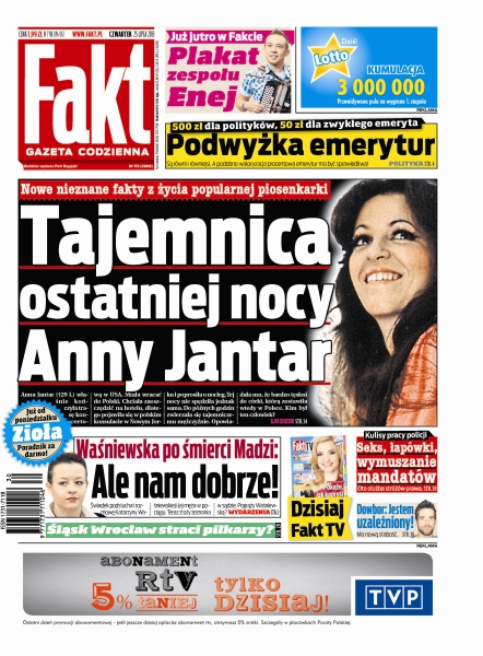 Nowe nieznane fakty z życia popularnej piosenkarki – tajemnica ostatniej nocy Anny Jantar; Waśniewska po śmierci Madzi – ale nam dobrze; czy Śląsk Wrocław straci piłkarzy; seks, łapówki, wymuszenia mandatów – tak wygląda służba stróżów prawa; są równi i równiejsi – a podobno waloryzacja procentowa emerytur ma być sprawiedliwa.