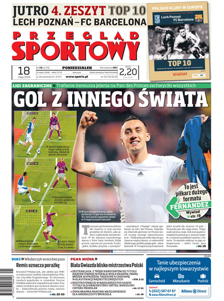 Bramka Ireneusza Jelenia na Parc des Princes zachwyciła wszystkich; Wisła zachowała pozycję lidera, wygrywając wysoko z ŁKS Łódź; władzom PZPN nie przeszkadza, że w polskiej ekstraklasie grają zawodnicy z zarzutami korupcyjnymi; Legia podtrzymała nadzieje na mistrzostwo; wywiad z Dariuszem Kołodziejem, pomocnikiem Górnika Zabrze; polscy szkoleniowcy nie chcą pracować u Wojciechowskiego, zamierza on latem zatrudnić trenera z zagranicy; jutro finał Remes Pucharu Polski; wywiad z Krzysztofem Włodarczykiem; siatkówka to moja miłość - rozmowa z Dorotą Świeniewicz; Agnieszka Radwańska wycofała się z turnieju Warsaw Open.