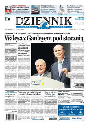 4 czerwca Lech Wałęsa i szef Libertas wspólnie spędzą w Gdańsku i Paryżu; wywiad z Jarosławem Wałęsą; dzisiejszy telewizyjny pojedynek premiera ze związkowcami może się nie odbyć; staczająca się w recesję niemiecka gospodarka ciągnie za sobą polskie przedsiębiorstwa; tylko 10 proc. Polaków, którzy wyjechali w poszukiwaniu pracy, zdecydowało się wrócić do kraju; do końca 2010 roku pracę może stracić nawet 6 mln mieszkańców UE; już po raz piąty Litwini wybierali prezydenta; milicja w Moskwie rozbiła demonstrację gejowską; rozmowa z Pawłem Kukizem.
