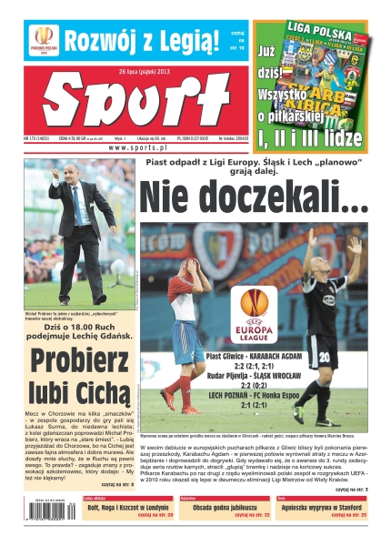 Nie doczekali – Piast odpadł z Ligi Europy, Śląsk i Lech „planowo” grają dalej – w swoim debiucie w europejskich pucharach piłkarze z Gliwic bliscy byli pokonania pierwszej przeszkody Karabachu Agdam; Probierz lubi Cichą – dziś o 18 Ruch podejmuje Lechię Gdańsk – mecz w Chorzowie ma kilka „smaczków” – w zespole gospodarzy do gry pali się Łukasz Surma, do niedawna lechista; Bolt, Noga i Kszczot w Londynie; Obsada godna jubileuszu – Dolomity nie wyłonią zwycięzcy – najpierw dwa etapy we Włoszech, a później pięć w Polsce; Agnieszka wygrywa w Stanford – pierwszy mecz Agnieszki Radwańskiej na twardym korcie na plus, w ćwierćfinale w Stanford jej rywalką będzie „uzbecka Amerykanka”, Varvara Lepchenko.