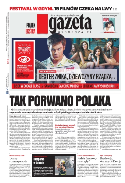 Tak porwano Polaka – „Myślę, że za parę dni wszystko stanie się jasne i ktoś zażąda okupu. Bo było to typowe zachowanie rabusiów” – opowiada naoczny świadek uprowadzenia w Syrii polskiego fotoreportera Marcina Sudera; Hiszpania w żałobie – 80 osób zginęło w jednej z największych katastrof kolejowych w historii Hiszpanii; czy nadzór finansowy straci zęby – czy Ministerstwo Finansów chce osłabić nadzór bankowy – według ministerialnych urzędników Komisja Nadzoru Finansowego nie powinna mieć uprawnień do wydawania tzw. rekomendacji dla banków, a to dziś najgroźniejsza – poza indywidualnymi inspekcjami – broń nadzoru bankowego; rząd swoje, obrońcy OFE swoje – jeśli OFE znikną, warszawska giełda będzie parkietem niestabilnym, zniską płynnością, ze strategicznymi spółkami narażonymi na wrogie przejęcia.