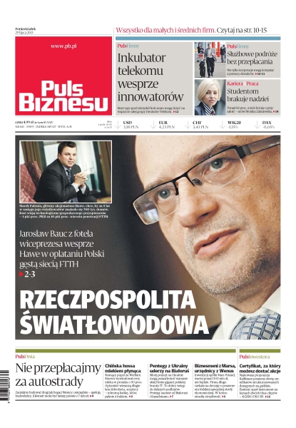 Rzeczpospolita światłowodowa – Jarosław Bauc z fotela wiceprezesa wesprze Hawe w oplataniu Polski gęstą siecią FTTH; inkubator telekomu wesprze innowatorów – start-upy spod skrzydeł hub:raum mogą liczyć na wsparcie całej grupy Deutsche Telekom; służbowe podróże bez przepłacania – nie tylko korporacje mogą korzystać z pomocy doradców; nie przepłacajmy za autostrady – zacznijmy budować drogi jak bogaci Niemcy: oszczędnie — apelują budowlańcy – kilometr może być tańszy prawie o 7 mln zł; chińska hossa mlekiem płynąca – rosnący popyt za Wielkim Murem wywindował ceny mleka w proszku o 50 procent.