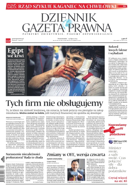 Tych firm nie obsługujemy – to, że klient ma zdolność kredytową, nie oznacza, że bank pożyczy mu pieniądze na zakup mieszkania – można zostać na lodzie, jeśli instytucji finansowej nie spodoba się deweloper; rząd szykuje kaganiec na chwilówki; Egipt we krwi – światowa mekka turystów pogrąża się w chaosie – tym razem na ulice wyszli islamiści oburzeni odsunięciem od władzy przez wojsko 3 lipca prezydenta Muhammada Mursiego; rekord lewych faktur i wyłudzeń – w I półroczu 2013 r. inspektorzy ze Śląska wykryli lewe dokumenty opiewające na 1,82 mld zł; zmiany w OFE, wersja czwarta – członek Rady Gospodarczej przy premierze przygotował kompromisowy wariant zmian w OFE.