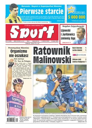 Ratownik Malinowski – w pierwszym wczorajszym spotkaniu T-Mobile Ekstraklasy Ruch Chorzów tylko zremisował przy Cichej z gdańską Lechią 1-1 – podobnie jak przed tygodniem w meczu z Lechem, punkt „Niebieskim” uratował Marcin Malinowski; organizmu nie oszukasz – Przemysław Niemiec dziś startuje w 70. Tour de Pologne; pierwsze starcie – Borussia Dortmund i Bayern Monachium w walce o Superpuchar Niemiec – Bundesliga wznawia rozgrywki dopiero za dwa tygodnie, ale już dziś wieczorem oczy fanów futbolu w Europie będą zwrócone na Dortmund gdzie na Signal Iduna Park finaliści Ligi Mistrzów zagrają ze sobą po raz pierwszy od pamiętnego finału na Wembley; Lijewski i Jurkiewicz zmienią ligę – Górnik sięga po zawodników już ukształtowanych.
