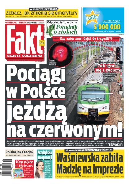 Pociągi w Polsce jeżdżą na czerwonym – czy znów musi dojść do tragedii; Waśniewska zabiła Madzię na imprezie – nowe szokujące zeznania policjanta; Anna Przybylska po operacji – lekarze w Gdańsku usunęli aktorce guza trzustki; Polska jak Grecja – sejm już zadecydował; zobacz jak zmienią się emerytury – rząd już zdecydował, ile pieniędzy wypłaci w przyszłym roku emerytom; Linda zagra generała – Agnieszka Holland kręci film o rodzinie Jaruzelskich; Maserak w Sopocie – pruł fale niczym wodolot; Stuhr da nazwisko cudzemu dziecku – żona aktora jest w ciąży z innym.