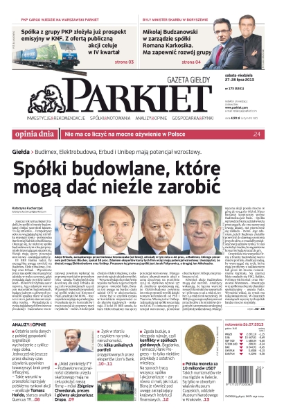 Spółki budowlane, które mogą dać nieźle zarobić – Budimex, Elektrobudowa, Erbud i Unibep mają potencjał wzrostowy; były minister skarbu w Boryszewie – Mikołaj Budzanowski w zarządzie spółki Romana Karkosika, ma zapewnić rozwój grupy; PKP Cargo wjedzie na warszawski parkiet – spółka z grupy PKP złożyła już prospekt emisyjny w KNF, z ofertą publiczną akcji celuje w IV kwartał; polska moneta za 10 milionów USD – takich numizmatów nie ma nigdzie w świecie – są tylko w otwartym właśnie Muzeum Czapskich, oddziale Muzeum Narodowego w Krakowie; zysk w starciu z ryzykiem na rynku nieruchomości – oto kilka unikalnych portfeli przygotowanych przez ekspertów Lion’s Bank.
