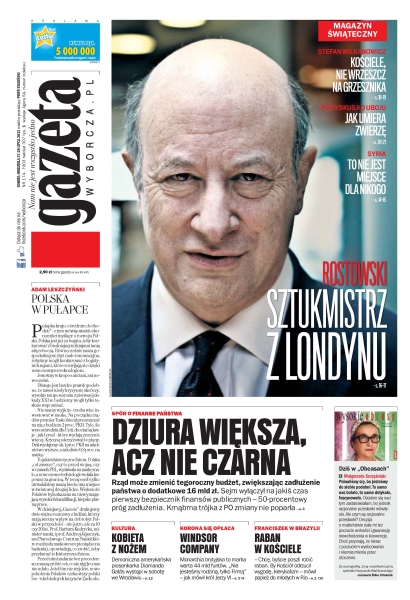 Dziura większa, acz nie czarna – rząd może zmienić tegoroczny budżet, zwiększając zadłużenie państwa o dodatkowe 16 mld zł – sejm wyłączył na jakiś czas pierwszy bezpiecznik finansów publicznych – 50-procentowy próg zadłużenia; Polska w pułapce – pułapka kraju o średnim dochodzie” – otym mówią ostatnio ekonomiści myślący o rozwoju Polski; kobieta z nożem – demoniczna amerykańska piosenkarka Diamanda Galás wystąpi w sobotę we Wrocławiu; Windsor Company – monarchia brytyjska to marka warta 44 mld funtów – „Nie jesteśmy rodziną, tylko Firmą” – jak mówił król Jerzy VI; raban w kościele – „Chcę, byście poszli robić raban. By Kościół odrzucił wygodę, klerykalizm” – mówił papież do młodych w Rio.