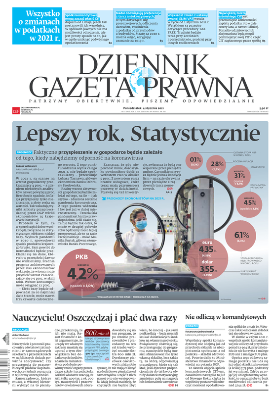 Gazetę wzbogacają praktyczne dodatki dla specjalistów, niedostępne w kioskach: Księgowość i Podatki, Rachunkowość i Audyt, Firma i Prawo, Samorząd i Administracja, Prawnik, Kadry i Płace, Ubezpieczenia i Świadczenia. NOWOŚĆ 2021 r. dodatki Biuro Rachunkowe i Księgowość Budżetowa (dostępne raz w miesiącu). Dodatkowo publikujemy wyjątkowo cenione przez Czytelników specjalne dodatki dotyczące najważniejszych zmian, nowych rozwiązań, na gorąco odpowiadamy na pytania. Piszemy o pracy zdalnej, o tarczach antykryzysowych, o nowych przepisach do walki z epidemią, o sposobach walki z zatorami płatniczymi i nowych obowiązkach pracodawców. Zapewniamy bezpieczeństwo w stosowaniu zmieniającego się prawa.