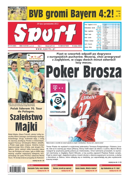 Poker Brosza – Piast w czwartek odpadł w dogrywce z europejskich pucharów – wczoraj, choć przegrywał z Zagłębiem, w ciągu dwóch minut odwrócił losy meczu; szaleństwo Majki – Polak liderem 70. Tour de Pologne – Rafał Majka (Saxo-Tinkoff) zdobył żółtą koszulkę lidera naszego narodowego wyścigu kolarskiego; zwycięskie Tychy, remis Rybnika; piłka ręczna – Mariusz Jurasik po operacji; siatkówka – koniec tematu „Wlazły w kadrze”; Agnieszka Radwańska po 13. tytuł – w nocy polskiego czasu Agnieszka Radwańska grała w Stanford ze Słowaczką Dominiką Cibulkovą o swój 13. tytuł w turniejach z cyklu WTA Tour; Borussia Dortmund gromi Bayern Monachium 4-2.