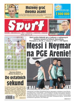 Messi i Neymar na PGE Arenie – dziś Lechia Gdańsk gra z jednym z najlepszych klubów świata w historii, Barceloną; do ostatnich sekund – w ostatnim meczu II kolejki T-Mobile Ekstraklasy Korona Kielce przegrała wczoraj na własnym stadionie z Wisłą Kraków 2-3; kurs dojrzewania – zmiana jeszcze w pierwszej połowie nie była dla Piotrka Malinowskiego miła ale każdy zawodnik za coś pobiera pieniądze – mówi Czesław Michniewicz, trener „Górali”; i jeszcze „Rzeźnik” – Jakub Rzeźniczak to kolejny defensor mistrzów Polski, który z powodu kontuzji nie wystąpi w jutrzejszym meczu z norweskim Molde FK; cena błędów – w finale turnieju WTA w Stanford Agnieszka Radwańska przegrała z Dominiką Cibulkovą, po raz pierwszy.