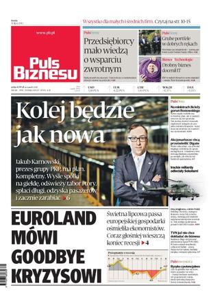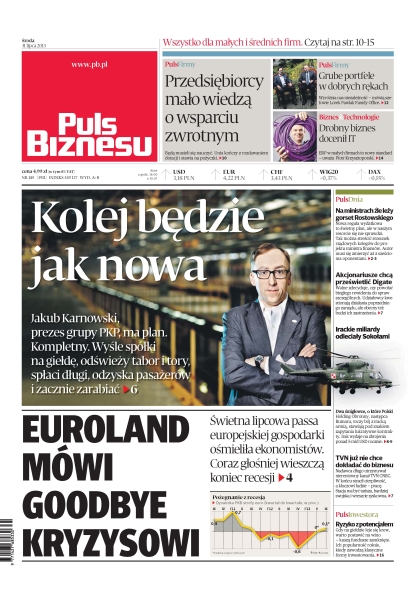 Kolej będzie jak nowa – Jakub Karnowski, prezes grupy PKP, ma plan, kompletny – wyśle spółki na giełdę, odświeży tabor i tory, spłaci długi, odzyska pasażerów i zacznie zarabiać; Euroland mówi goodbye kryzysowi – świetna lipcowa passa europejskiej gospodarki ośmieliła ekonomistów – coraz głośniej wieszczą koniec recesji; przedsiębiorcy mało wiedzą o wsparciu zwrotnym – będą musieli się nauczyć, Unia kończy z rozdawaniem dotacji i stawia na pożyczki; na ministrach źle leży gorset Rostowskiego – nowa reguła wydatkowa to świetny plan, ale w naszym resorcie się nie sprawdzi – tak można streścić stosunek rządowych kolegów do projektu ministra finansów; irackie miliardy odleciały Sokołami – dwa śmigłowce, o które Polski Holding Obronny, następca Bumaru, toczy bój z iracką armią, stawiają pod znakiem zapytania lukratywne kontrakty.