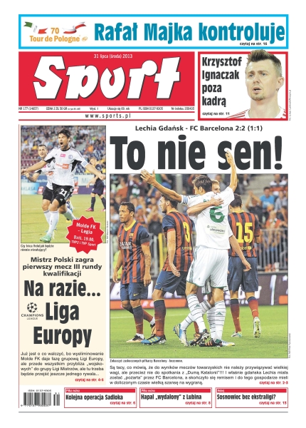 To nie sen – Lechia Gdańsk zremisowała z FC Barceloną 2-2; na razie Liga Europy – Mistrz Polski zagra pierwszy mecz III rundy kwalifikacji – jest o co walczyć, bo wyeliminowanie Molde FK daje fazę grupową Ligi Europy, ale przede wszystkim przybliża „wojskowych” do grupy Ligi Mistrzów, ale tu trzeba będzie przejść jeszcze jednego rywala; Krzysztof Ignaczak poza kadrą; Rafał Majka kontroluje; kolejna operacja Macieja Sadloka – nie kończy się zdrowotna gehenna piłkarza, a Jakub Smektała otrzymał propozycję przejścia do pierwszoligowej Arki Gdynia; Hapal „wydalony” z Lubina – ledwie po dwóch kolejkach stracili cierpliwość działacze „miedziowych”.