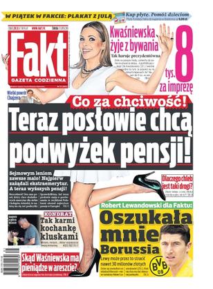 Co za chciwość – teraz posłowie chcą podwyżek pensji – sejmowym leniom zawsze mało, najpierw zażądali ekstraemerytur, a teraz wyższych pensji; wielki powrót Zygmunta Chajzera; Aleksandra Kwaśniewska żyje z bywania – tak haruje prezydentówna; Marek Kondrat – tak karmi kochankę kluskami; skąd Waśniewska ma pieniądze w areszcie – oskarżona regularnie dostaje przelewy; Robert Lewandowski dla Faktu: „Oszukała mnie Borussia” – Lewy może przez to stracić nawet 30 milionów złotych; dlaczego chleb jest taki drogi – zboże tanieje, a ceny chleba i tak idą w górę.