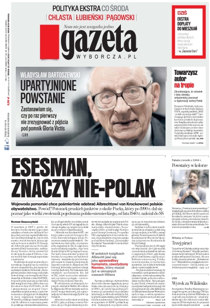 Esesman, znaczy nie-Polak – wojewoda pomorski chce pośmiertnie odebrać Albrechtowi von Krockowowi polskie obywatelstwo – potomek pruskich junkrów z okolic Pucka, który po 1990 r. dał się poznać jako wielki zwolennik pojednania polsko-niemieckiego, od lata 1940 r. należał do SS; upartyjnione powstanie – „Zastanawiam się, czy po raz pierwszy nie zrezygnować z pójścia pod pomnik Gloria Victis” – Władysław Bartoszewski; towarzysz autor na tropie – zdumiewające, że człowiek z taką obsesją antysemicką pracował w dyplomacji wolnej Polski; powstańcy w kolorze – zwiastun „Powstania warszawskiego” wygląda jak zapowiedź hollywoodzkiej produkcji; wyrok za Wikileaks – szeregowiec Bradley Manning nie pomagał wrogowi, przekazując 700 tys. dokumentów portalowi Wikileaks, za co groziło mu dożywocie – uznał wojskowy sąd.