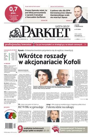 Wkrótce roszady w akcjonariacie Kofoli – Enterprise Investors przymierza się do wyjścia z inwestycji; BZ WBK wyprzedaje – Arka mniej warta niż Quercus; 9 analityków technicznych typuje spółki na sierpień; Falenta idzie na zakupy – ZWG przejmuje współpracującą z Bogdanką spółkę Kobud; prezes Gamratu mówi, że jest bliżej porozumienia w sprawie transakcji z francuskim Gerflorem; giełda rozczarowana – II połowa roku dla GPW kierowanej przez Adama Maciejewskiego wcale nie musi być lepsza; profesjonalny inwestor – czy już korzystałeś ze strategii gry na lukach cenowych; Tauron podpisał umowę z Bankiem Gospodarstwa Krajowego, w ramach której wyemituje obligacje warte 1 miliard złotych.