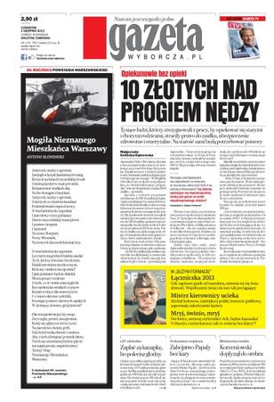 10 złotych nad progiem biedy – tysiące ludzi, którzy zrezygnowali z pracy, by opiekować się starymi i chorymi rodzicami, straciły prawo do zasiłku, ubezpieczenie zdrowotne i emerytalne – na starość sami będą potrzebować pomocy; łączniczka 2013 – gdy zapinam guzik od munduru, zmienia mi się świadomość, współczesny świat nie jest tak pociągający; mistrz kierownicy ucieka – Michał Sołowow, największy polski inwestor giełdowy, zapowiada zakończenie kariery; mryj, świnio, mryj – nie kwicz, umieraj szybciutko! Ach, będzie kaszanka; zapłać za kanapkę, bo polecisz głodny – opłaty za posiłki pojawią się tylko na krótszych trasach i tylko w klasie ekonomicznej – LOT szuka pieniędzy, gdzie może; zabójstwo Papały bez kary – „Sąd po 15 latach może stwierdzić tylko to, że nie wie, dlaczego zabito generała Marka Papałę” – sędzia Paweł Dobosz skrytykował również pracę prokuratury.