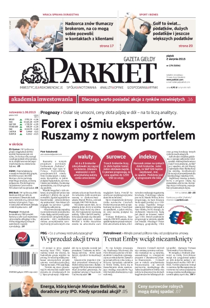 Forex i ośmiu ekspertów, ruszamy z nowym portfelem – dolar się umocni ceny złota pójdą w dół, na to liczą analitycy; akademia inwestowania – dlaczego warto posiadać akcje z rynków rozwiniętych; nadzorca znów tłumaczy brokerom, na co mogą sobie pozwolić w kontaktach z klientami; golf to świat podatków, dużych podatków i jeszcze większych podatków; PBG – wyprzedaż akcji trwa – co z umową restrukturyzacyjną; Petrolinvest – temat Emby wciąż niezamknięty – minęło półtora roku od podpisania umowy; Energa, którą kieruje Mirosław Bieliński, ma doradców przy IPO – kiedy sprzedaż akcji; KGHM – zapowiadają się roszady w miedziowej spółce – KGHM Ecoren i KGHM Metraco, które już mają wspólnego prezesa, zostaną połączone; wskaźnik koniunktury PMI przebił barierę 50 pkt i jest najwyższy od początku ubiegłego roku.