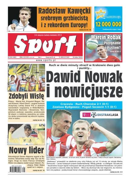 Dawid Nowak i nowicjusze – Ruch w dwie minuty stracił w Krakowie dwa gole i punkty; nowy lider – Kolumbijczyk Darwin Atapuma wygrał w Bukowinie Tatrzańskiej szósty etap Tour de Pologne, drugi na mecie Francuz Christophe Riblon został nowym liderem – poobijany Rafał Majka spadł na 3 miejsce; zdobyli Wisłę – Polacy: Maciej Kot, Krzysztof Biegun, Dawid Kubacki i Kamil Stoch wygrali konkurs drużynowy letniej Grand Prix w skokach narciarskich rozgrywany w Wiśle-Malince; Radosław Kawęcki srebrnym grzbiecistą i z rekordem Europy; nic nie zabije Barcelony – kiedy odchodzili Ronaldo, a potem Ronaldinho, przewidywano upadek „Dumy Katalonii”, ale to nie jednostki decydują o jej wielkości, tylko kolektyw.