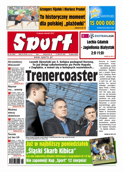 Leszek Ojrzyński po 3. kolejce pożegnał Koronę – to już drugi szkoleniowiec po Pavle Hapalu z Zagłębia, a mówi się o kolejnych nazwiskach; lawina spekulacji ruszyła, a nazwisko Macieja Skorży jest najczęściej powtarzane na trenerskiej giełdzie, wśród potencjalnych następców obecnego opiekuna „Kolejorza”; na towarzyskich turniejach czołowe włoskie zespoły w ostatni weekend były „chłopcami do bicia”; Tomasz Majewski twierdzi, że nie jest przygotowany do walki, ale mimo wszystko liczy, że ze stolicy Rosji wróci z medalem; Michał Kwiatkowski zajął w tym roku 11. miejsce w Tour de France, ale nie zamierza na tym poprzestać – celuje w medal wrześniowych mistrzostw świata w jeździe na czas; nasza druga rakieta grała wczoraj zbyt nierówno, by pokonać niżej notowaną, ale doświadczoną rywalkę; stale czegoś nam brakowało, dlatego wierzymy, że ten medal to dobry prognostyk na przyszłość – twierdzą Grzegorz Fijałek i Mariusz Prudel, trzeci duet mistrzostw Europy „plażowiczów”.