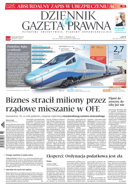 Absurdalny zapis w ubezpieczeniu AC; w piątek pierwszy z 20 pendolino zamówionych dla PKP Intercity wyruszy do Polski z fabryki w Savigliano; samorządy likwidują izby w ramach oszczędności, a problem nietrzeźwych przerzucają na policję; jest już pierwsza firma, która po rządowych propozycjach zmian w OFE zdecydowała się spisać na straty część inwestycji w powszechne towarzystwo emerytalne; system podatkowy jest tak złej jakości, że konieczne są natychmiastowe działania; w latach 2013–2016 liczba punktów sieci zmniejszy się o ok. 20 proc.; sądownictwo dyscyplinarne prawników czeka trzęsienie ziemi – formuła sądzenia kolegów przez kolegów się wyczerpała.