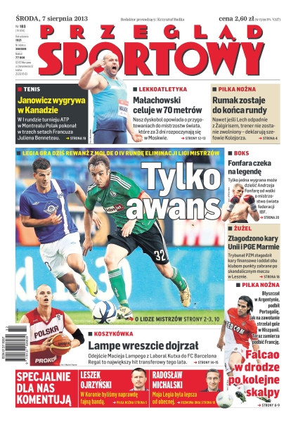 Mistrzowie Polski wyciągnęli wnioski, zapomnieli o meczu w Norwegii i nie dopuszczają innej możliwości niż awans; nawet jeśli Kolejorz odpadnie z Żalgirisem Wilno, trener Mariusz Rumak nie zostanie zwolniony – tak twierdzą szefowie klubu; trener Chelsea zdyskredytował Cristiano Ronaldo i Real Madryt; Piotr Małachowski nie wyklucza siedemdziesiątki; odejście Macieja Lampego z Laboral Kutxa do FC Barcelona Regal to największy hit transferowy tego lata; biało-czerwoni zaczęli zgrupowanie w Spale – dwaj liderzy kadry wracają do formy po wirusie bostońskim; w pierwszej rundzie turnieju w Montrealu Jerzy Janowicz pokonał 3:6, 6:3, 7:5 Juliena Benneteau; tylko jedna wygrana może dzielić Andrzeja Fonfarę od walki o mistrzostwo.