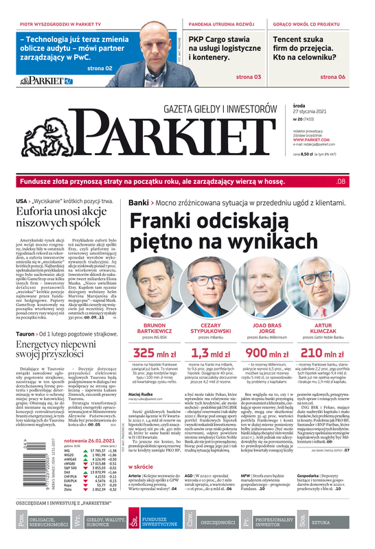 Największy w Polsce newsroom gospodarczy zbiera, analizuje i zgłębia dla Państwa najważniejsze informacje ze świata finansów. Codzienne wydanie „Parkietu”, sześć dni w tygodniu, to kilkadziesiąt artykułów o emitentach, instytucjach finansowych, gospodarce. To również opinie, felietony i wywiady z najważniejszymi ludźmi krajowej i globalnej finansjery.