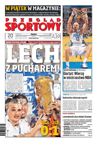Lech zwycięzcą Remes Pucharu polski; wywiad ze Sławomirem Peszką; dziś finał Pucharu UEFA; Śląsk Wrocław zamierza sprowadzić bramkarza z Primera Division; Arka, ŁKS, Polonia, Cracovia i Piast będą mogły liczyć na wyrozumiałość; wywiad z Markiem Motyką, nowym trenerem Korony Kielce; w sobotę Inter, Barcelona i Manchester United wywalczyły tytuły, w nowym sezonie chcą być jeszcze mocniejsze; Marcin Gortat wierzy w mistrzostwo NBA; selekcjoner Daniel Castellani wybrał kapitanem Michała Bąkiewicza; Urszula Radwańska awansowała do drugiej rundy Warsaw Open.