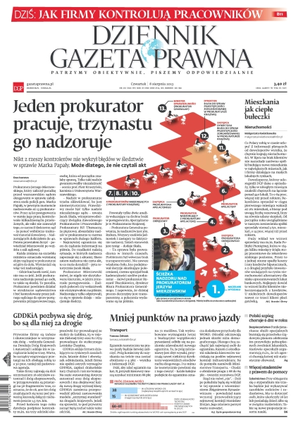 Jak firmy kontrolują pracowników; nikt z rzeszy kontrolerów nie wykrył błędów w śledztwie w sprawie Marka Papały – może dlatego, że nie czytali akt; co Polacy robią w czasie urlopu – z informacji płynących od deweloperów wynika, że chętnie kupują nieruchomości; prywatne firmy są tańsze i skuteczniejsze w utrzymaniu dróg – wyliczyła Generalna Dyrekcja Dróg Krajowych i Autostrad i oddaje im w zarządzanie kolejne trasy; egzamin teoretyczny na prawo jazdy będzie łatwiej zaliczyć; funkcjonariusze służb specjalnych buntują się przeciwko rządowym planom odebrania im przywileju pełnopłatnych zwolnień lekarskich; przy ubieganiu się o stypendium nie trzeba będzie już wykazywać zarobków rodziców i rodzeństwa.