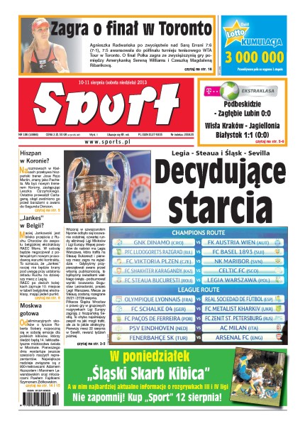 Odbyło się losowanie ostatniej kolejki eliminacji Ligi Mistrzów i Ligi Europy; hiszpański trener Jose Rojo Martin ma być nowym trenerem Korony Kielce; Agnieszka Radwańska pokonała Sarę Errani i awansowała do półfinału turnieju tenisowego WTA Tour w Toronto.