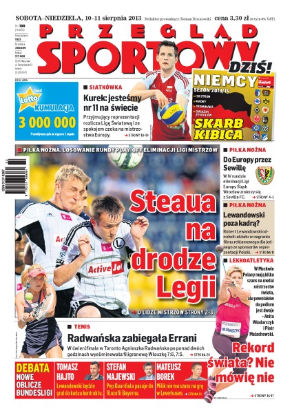 Legia Warszawa kolejny mecz zagra ze Steauą Bukareszt; Robert Lewandowski odmówił udziału w nagraniu filmu reklamowego dla jednego ze sponsorów reprezentacji Polski; Agnieszka Radwańska wygrała z Sarą Errani.
