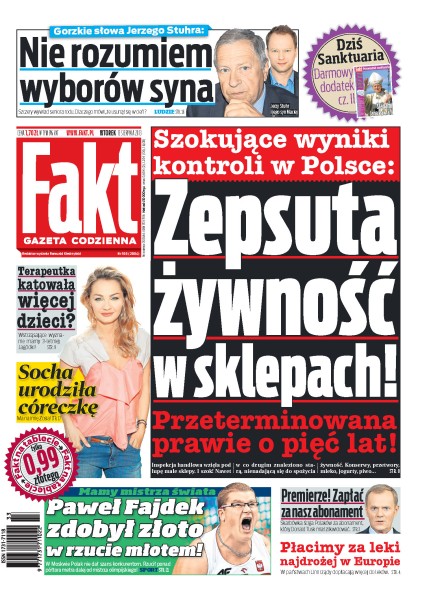 Paweł Fajdek zdobył złoto w rzucie młotem; Małgorzata Socha urodziła córkę; Jerzy Stuhr nie rozumie wyborów syna; płacimy za leki najdrożej w Europie.