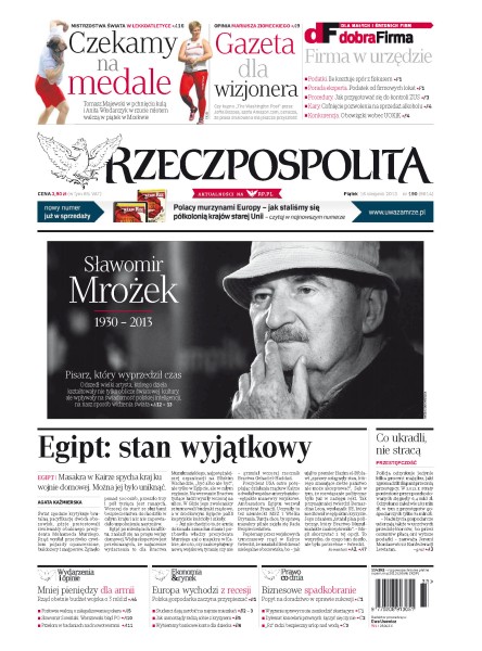 Zmarł Sławomir Mrożek, artysta, dramaturg i rysownik; masakra w Kairze spycha Egipt ku wojnie domowej; rośnie ponadpartyjna koalicja na rzecz zalegalizowania pokera sportowego w Polsce.