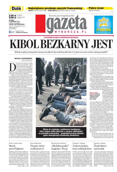 Kibole rządzą trybunami i straszą zwykłych obywateli na ulicach, czy ktoś wreszcie zrobi z nimi porządek; największe biura podróży ustaliły wczoraj, że ich klienci mogą bez opłat zmienić termin wycieczki do Egiptu lub miejsce wypoczynku; Niemiec, który ocalił puszczę – cud w Białowieży; „Medialna mafia” – magnata z Wysp; przemyt w bakach – 22 mln litrów na kwartał.